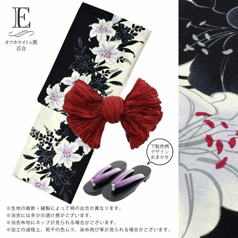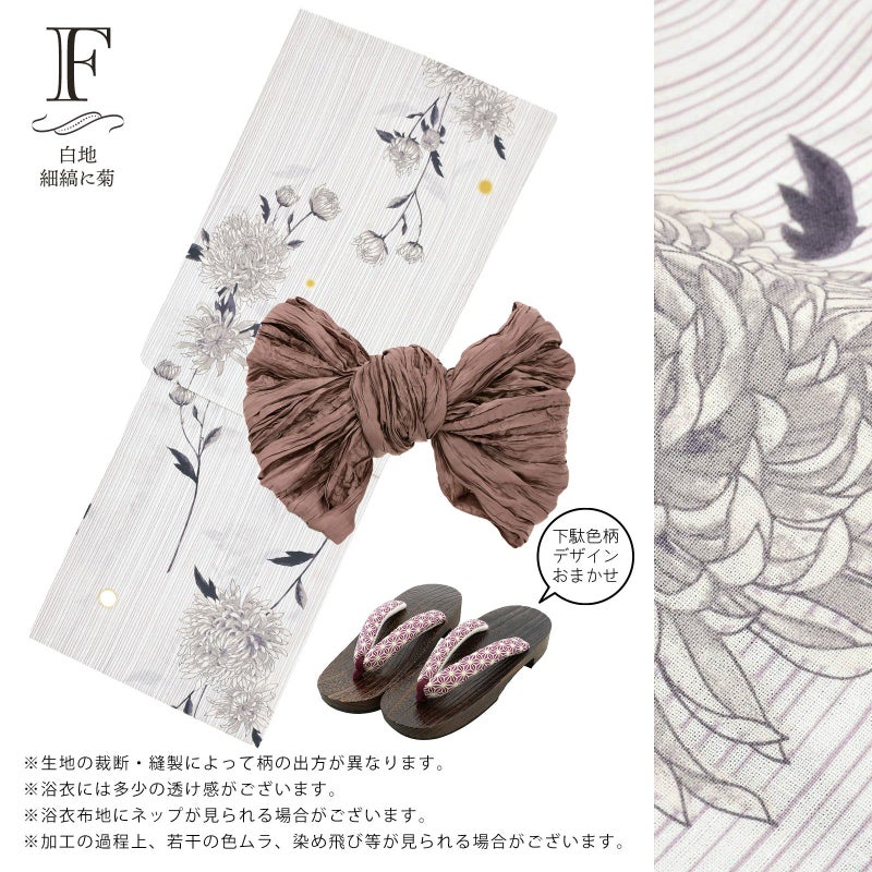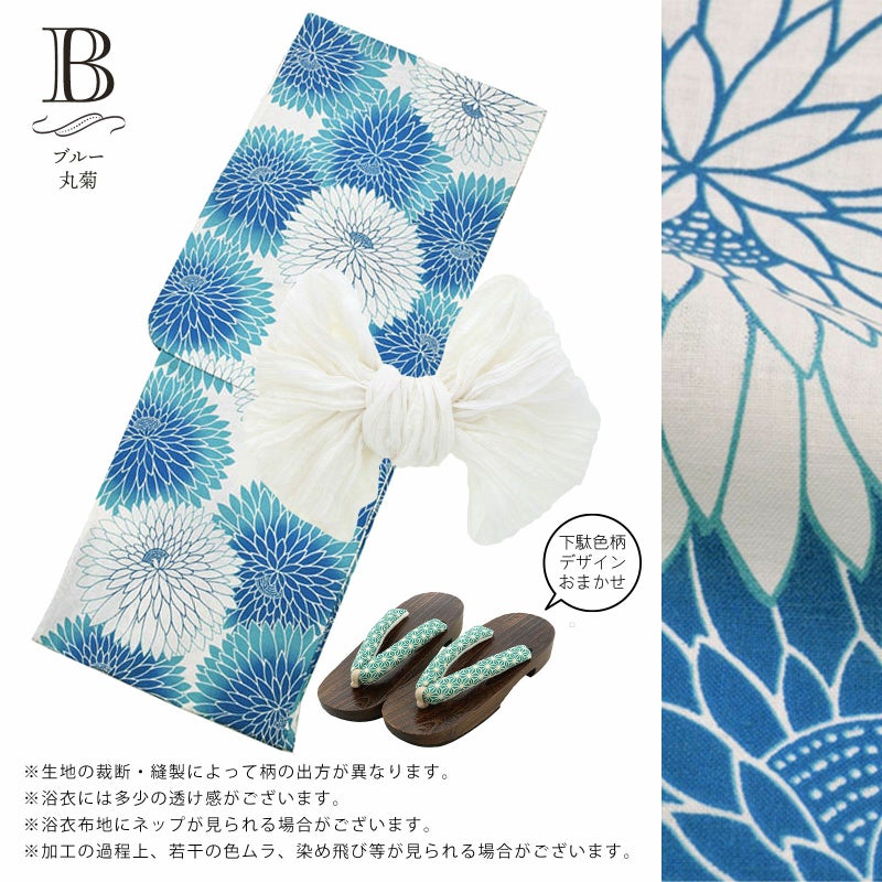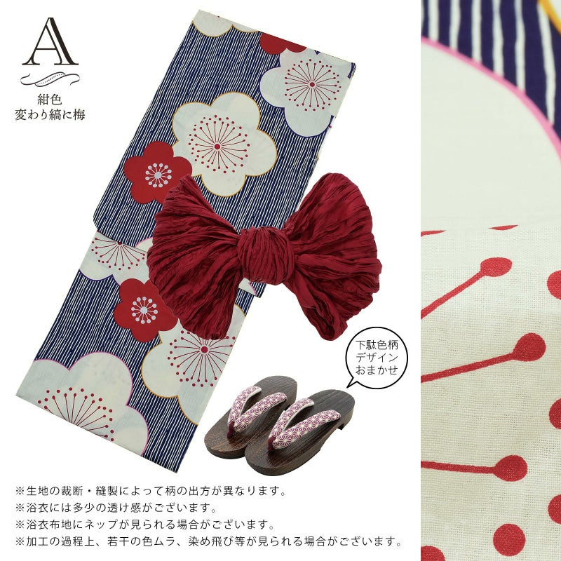 【商品内容】浴衣、帯、色柄おまかせ下駄の計3点セット