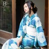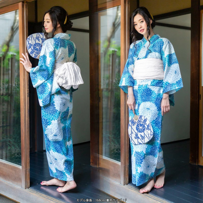 浴衣…ごく薄い生成り地に、ブルー系の色合いの丸菊模様。