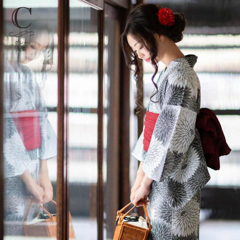 浴衣…ごく薄い生成り地に、黒グレー系の色合いの丸菊模様。