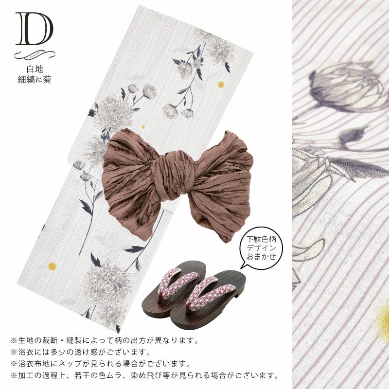 下駄は色柄おまかせでコーディネートしてお届けします。下駄のサイズはFサイズとなります。