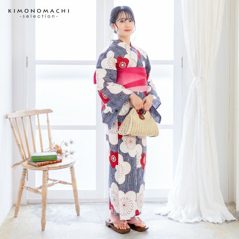 浴衣:紺色の細かな変わり縞に大きな梅のお花模様。