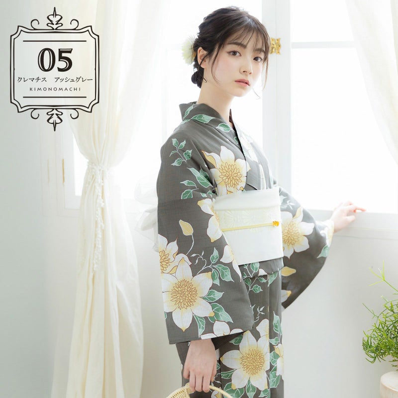浴衣:わずかに緑みのグレーの地。茶色の輪郭線で表された生成り色に淡い黄色のクレマチスの花。白い輪郭線にくすんだ緑と薄緑の葉。レトロな柄行と現代的なカラーが魅力の浴衣です。