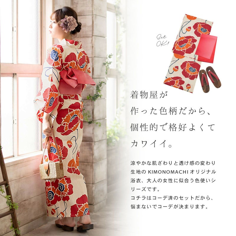 涼やかな肌ざわりと透け感の変わり生地のKIMONOMACHIオリジナル浴衣、大人の女性に似合う色使いシリーズです。
