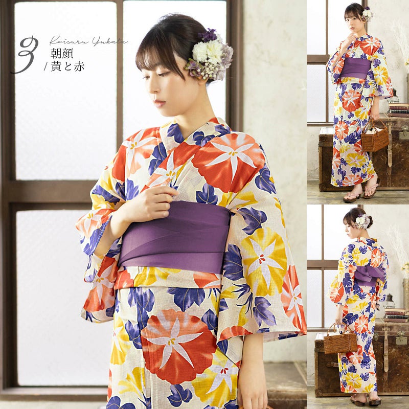 浴衣:生成り地に黄色と朱赤の大きな朝顔。葉は紺。