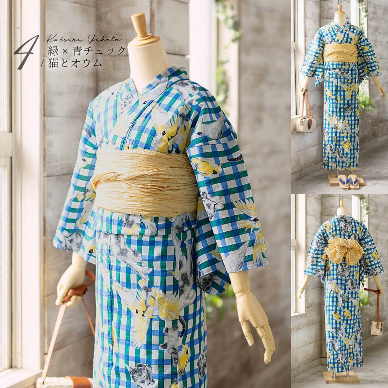 浴衣:白地に濃い緑色と水色の格子柄。格子が交差する部分が、濃い青色のアクセントになっています。格子の上全体に配された、表情豊かに動いているオウムとネコのイラストがとってもユニークで可愛らしい!中には寝ている子も。イラスト部分は、薄いグレーのラインで、猫は濃淡のグレー、オウムは白とクリームイエローの色使い。