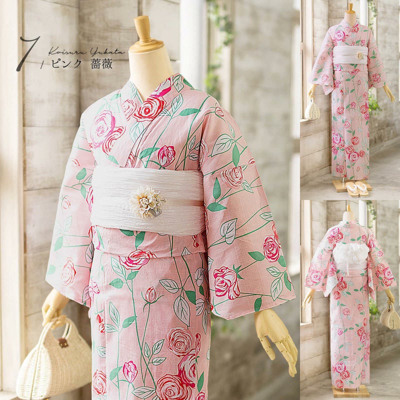 浴衣:白っぽいベビーピンク色地。細い線で、昭和レトロなムードの薔薇模様。花の部分は、白色に、ピンクよりの赤色に地色よりワントーン濃いピンク・ビビッドな濃淡のピンク色。茎と葉の部分は、青緑色と白色。