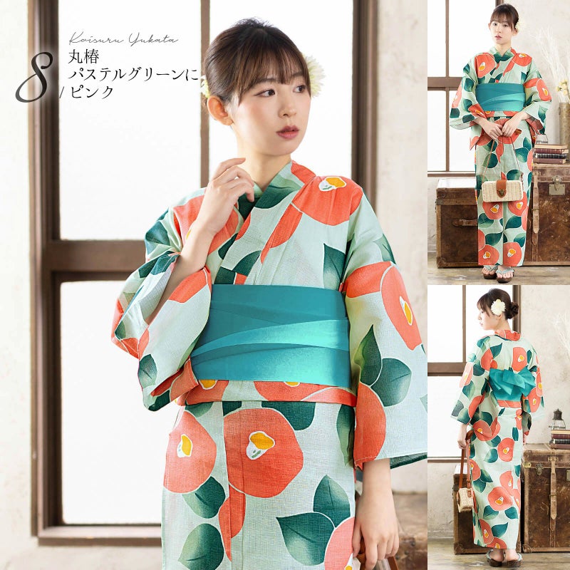 浴衣:パステルグリーン地にピンクの大きな丸椿