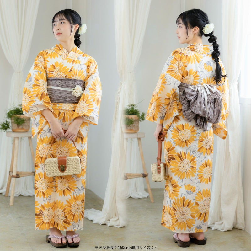 浴衣:淡いクリーム色の地に、モザイク調の黄色や茶色の大きなひまわりの花、グレーの葉。