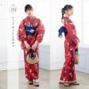 浴衣:ビビッドな印象がキュートなマリン柄。鮮やかな赤色に、太さの異なる明るい紺色の縦ライン。メリハリの効いた色合いの上のところどころに、黒いラインと白色で翼を広げて飛ぶカモメ、そして波の上に浮かぶ白いヨットのイラスト。