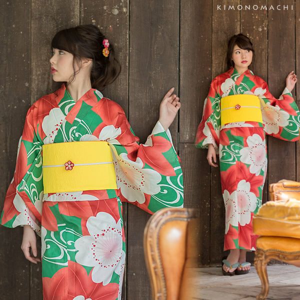 【カラー】浴衣は、明るく鮮やかな緑色地に、白色の流線模様。その上に、大きな桜と楓。桜はごく薄いピンク色に、中心はほんのりと濃いピンク色に朱色。楓は明るめの朱色。葉の淵と葉脈部分は薄い朱色。帯は鮮やかな黄色の色合い。