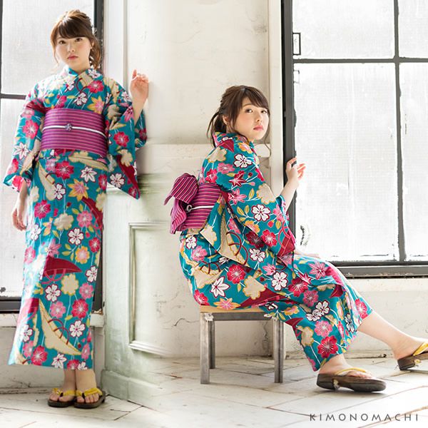 【カラー】浴衣は、強い青緑色地に、落ち着いた色使いの古典柄。縦に枝垂桜の模様、その上に鶯色とエンジ色の傘と紅葉。桜の花と紅葉の色使いは、エンジ色と、濃淡のピンク色、白色とエンジ色、暗めの黄色とピンク色。縦ラインの枝の白色もアクセントに。帯はパープル系の細かなストライプ。