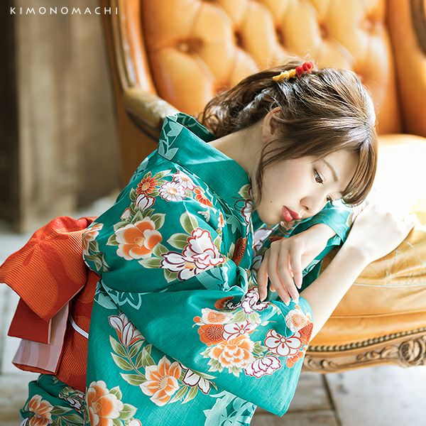 【カラー】浴衣は濃い青緑色地に牡丹、梅、椿などの花の丸紋模様。帯はレース風の織り模様の入った明るい濃いオレンジ色の色合い。