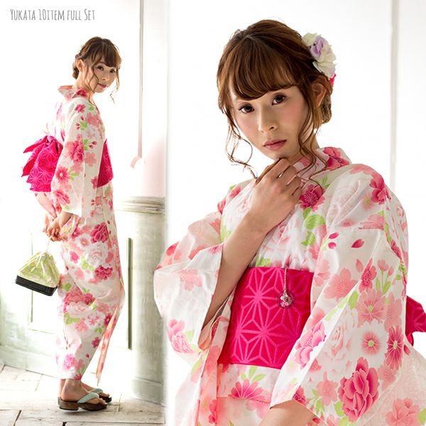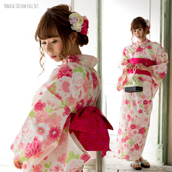 フリーサイズの女性浴衣、浴衣帯、下駄、籠巾着、浴衣着付けセット、浴衣飾りが付いた激安豪華10点セットです!!