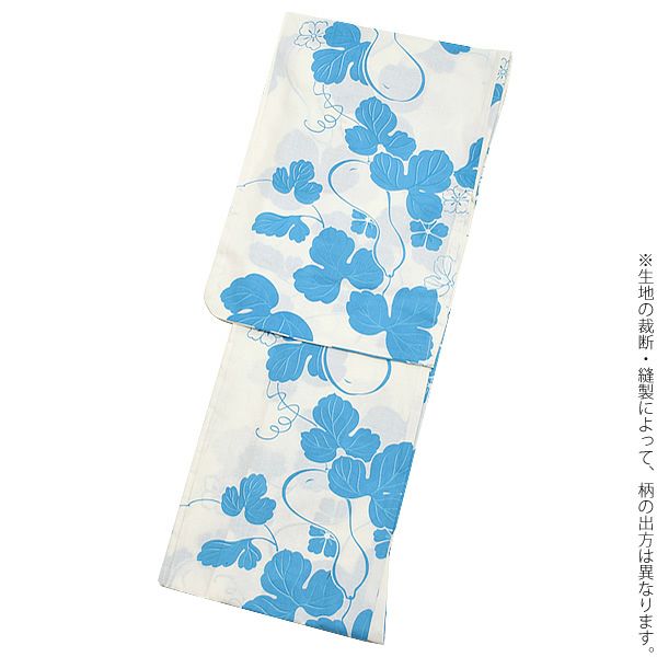 【カラー】浴衣は、柔らかな白色地に、柔らかさもある綺麗なブルーの色合いが大人のお洒落な雰囲気のひょうたん模様。帯は、少しくすんだ青色の色合いに変わり縞と小魚の模様。