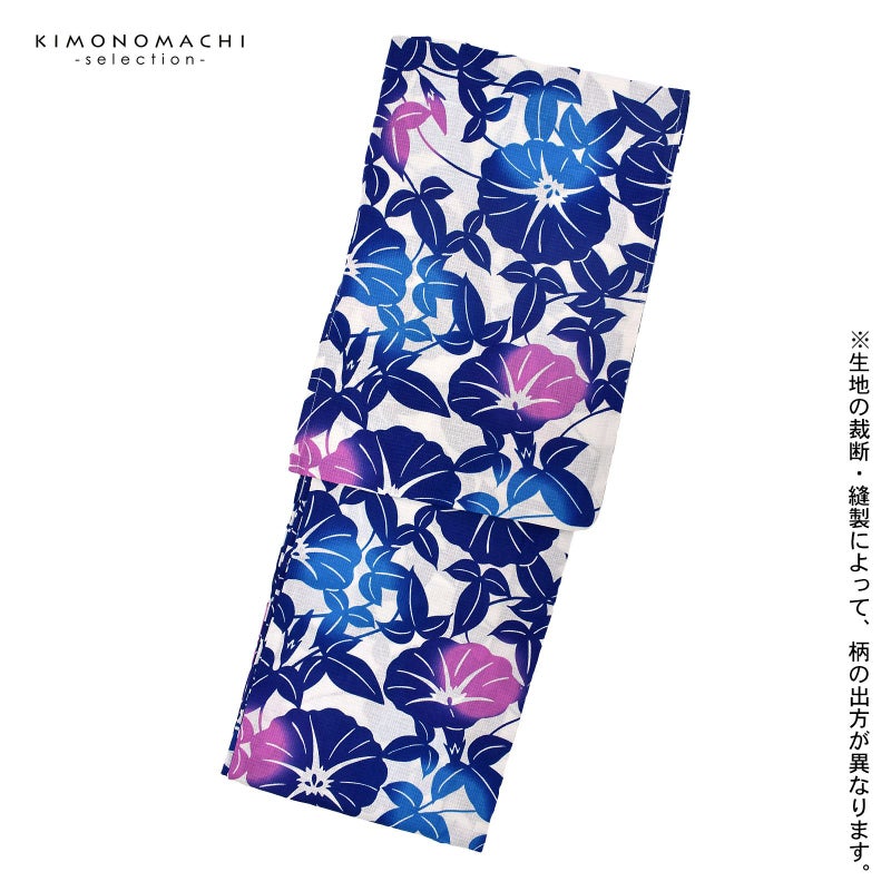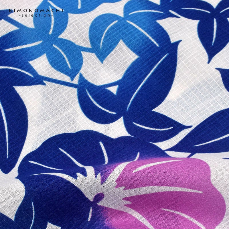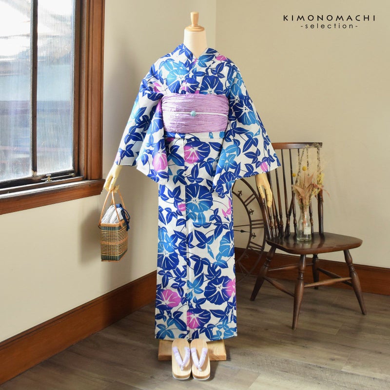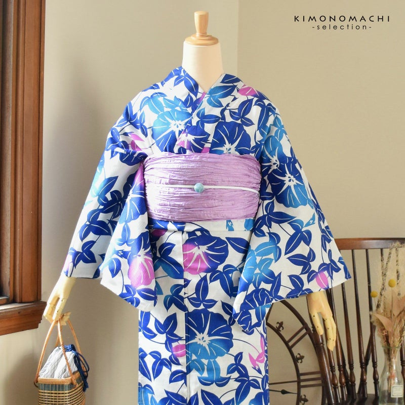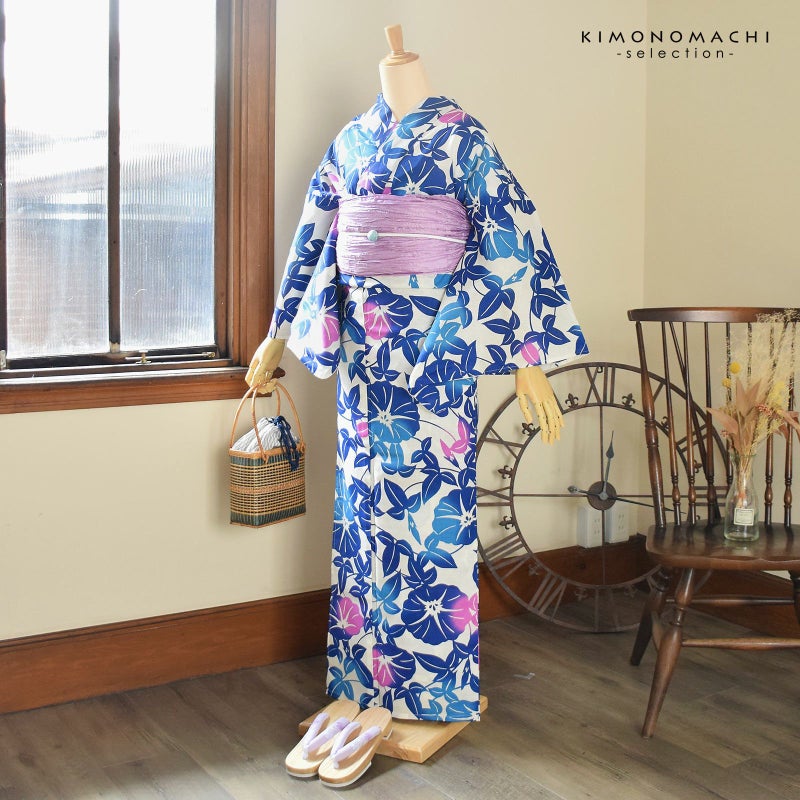 浴衣:オフホワイトの地に、型染調の朝顔の花や葉、蔓が全体に表現されています。紺色を基調に、ところどころ水色や赤紫みのピンクのぼかしが入っており、明るく鮮やかな印象です。