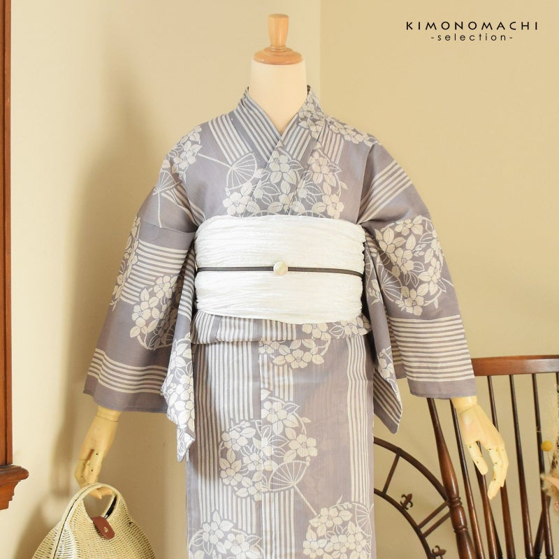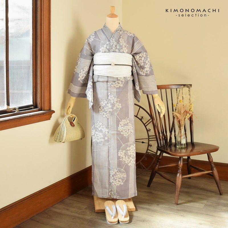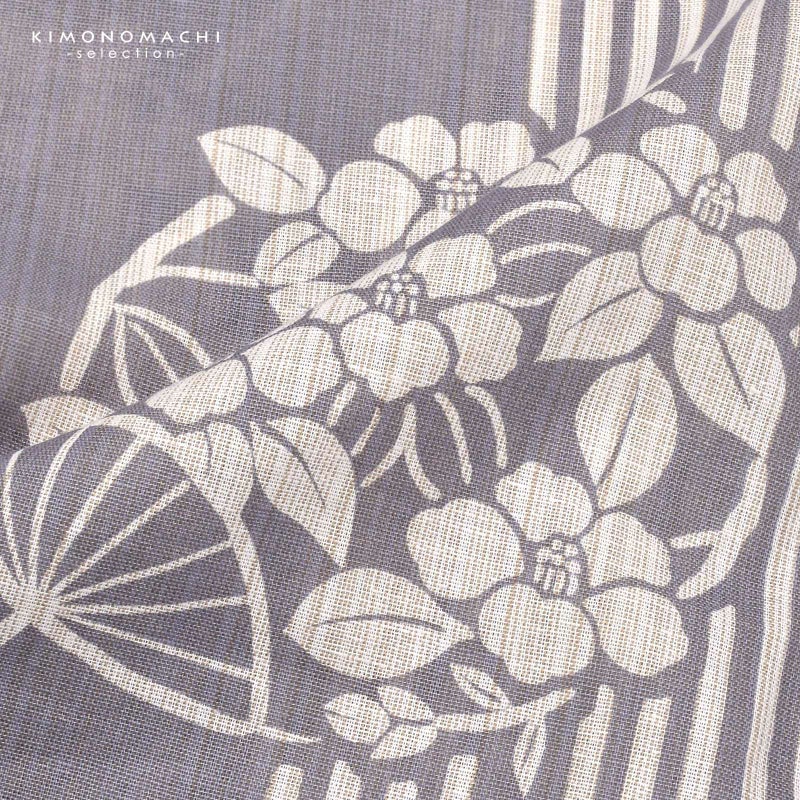 浴衣:生成り色と白の細かな縦縞の生地。淡いグレーと地色の縦縞に、椿の花模様の団扇の柄。古典的でスッキリとした大人の魅力を感じさせます。