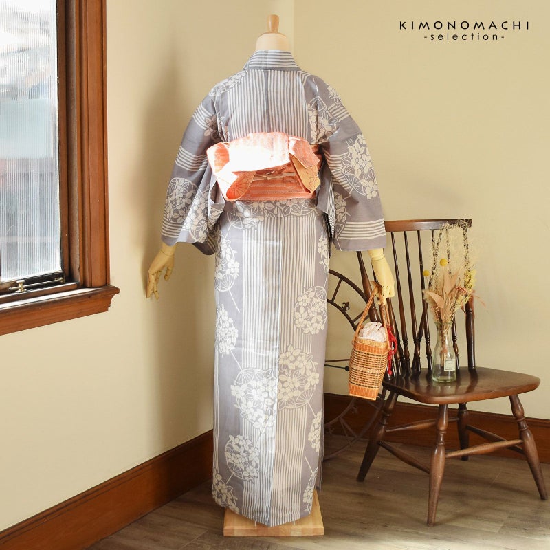 浴衣:生成り色と白の細かな縦縞の生地。淡いグレーと地色の縦縞に、椿の花模様の団扇の柄。古典的でスッキリとした大人の魅力を感じさせます。