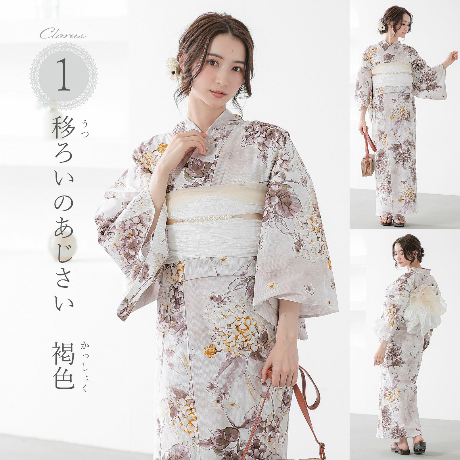 浴衣:白に淡いトープベージュの地。白やセピア色ににじんだ浅いパープルグレーで表現されたアジサイの花。挿し色としてのからし色と金茶色が、輝かしい思い出を感じさせます。