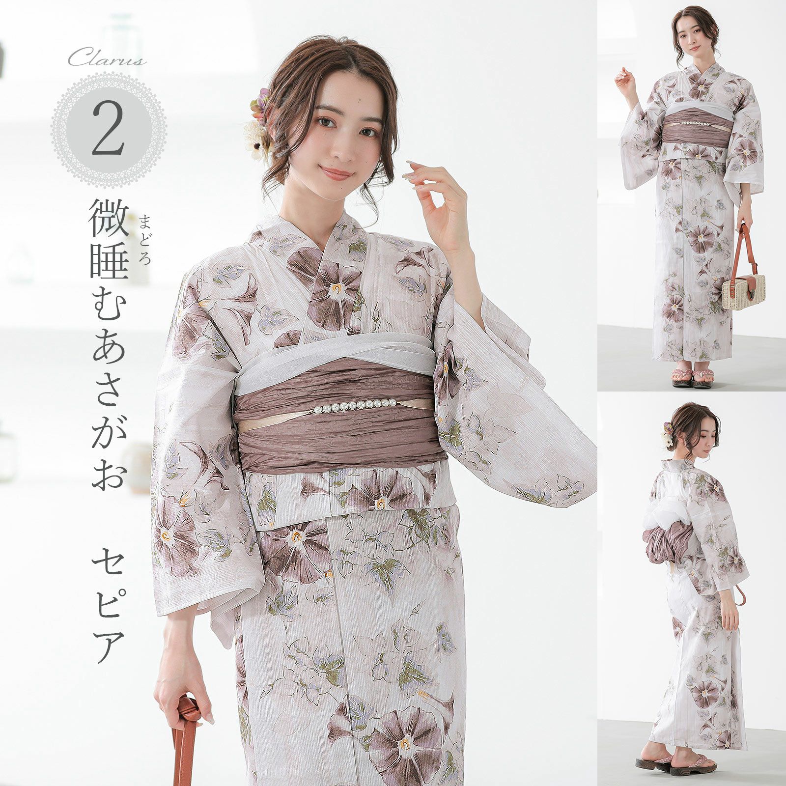浴衣:白にラフに色付けしたような淡いトープベージュ。淡くにじんだ水彩調の朝顔は、懐かしい記憶の中に咲いているかのよう。深い茶にセピア、浅いパープルグレーのぼかしの花、中央の山吹色がポイント。黄緑に淡い青紫の葉。