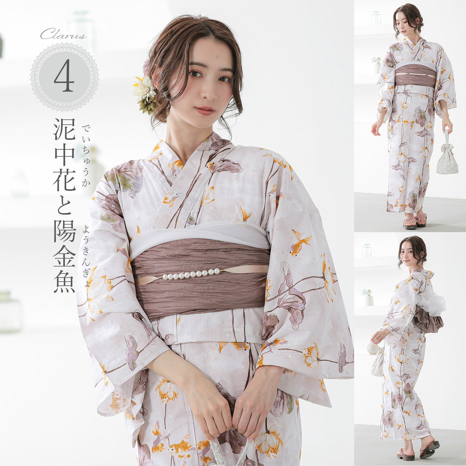 浴衣:白地にごく淡いトープベージュのぼかし。水彩調の蓮は、セピアにパープルグレー、黄緑の挿し色の入った葉、長く伸びた茎の先にからし色や金茶色に色づいた花、ベージュの影。金魚がふわふわと浮かび泳ぎ、古い伝承の世界のような不思議で懐かしい雰囲気です。