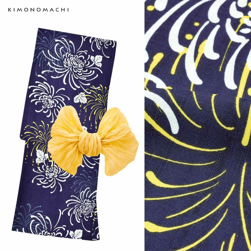 浴衣:青紫みの紺色の地。白抜きの管物の菊の合間に、冠菊の花火が開いています。花火の黄色や淡い青灰色が変化を与えています。