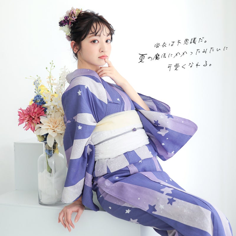 浴衣:灰みの青藤色の地に天の川のようなよろけた太いストライプ、手描き調の星。ストライプの中はミスティな薄紫のグラデーションに白い星々、星雲のようなほのかな黄色の挿し色。
