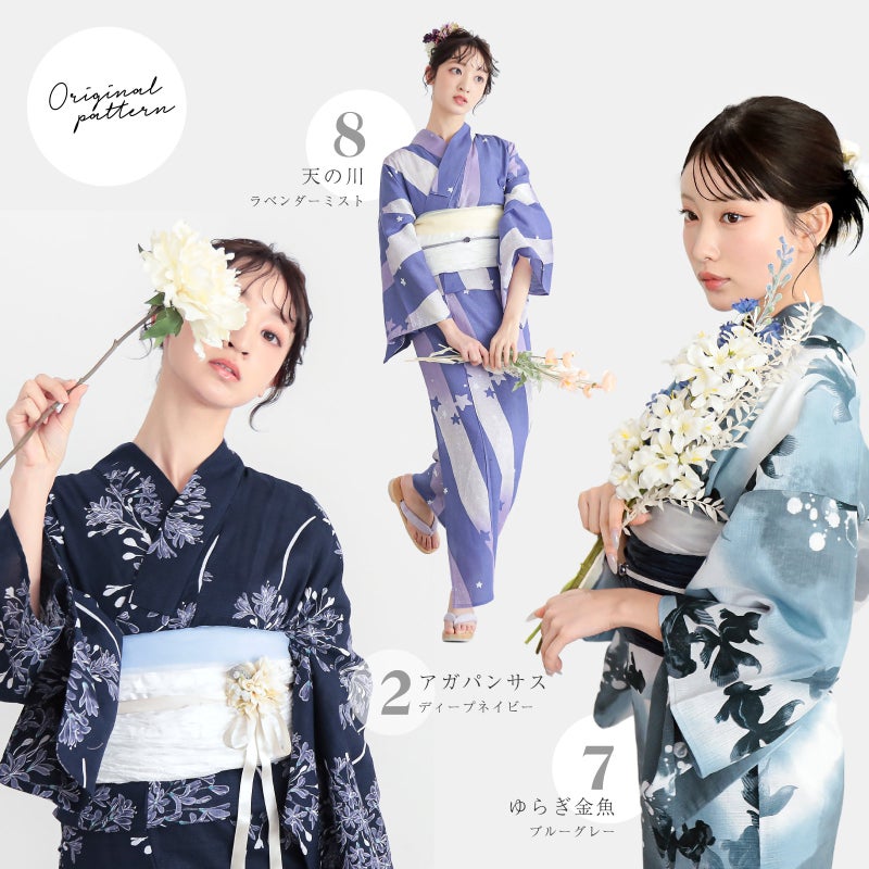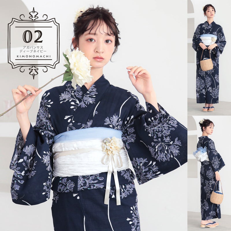 浴衣:深い紺地に白、浅い群青で表現されたアガパンサスの花。透明感のある花の中心に挿された淡いミントブルーが爽やかさを添えています。