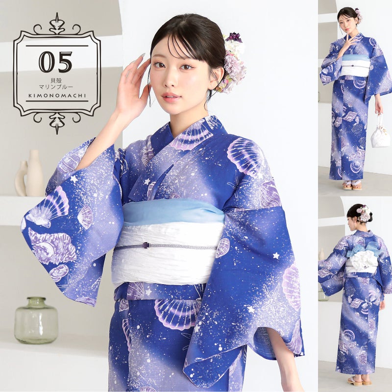 浴衣:グレイッシュな青紫みの水色とパープルのぼかしが入った地。星のような白い泡に、白の線、浅いブルーの陰影、コーラルピンクの挿し色で表現されたいろいろな形の貝殻。