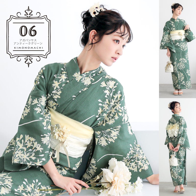 浴衣:やや鈍めの浅い緑地に白、淡いクリームイエローで表現されたアガパンサスの花。透明感のある花の中心に挿された淡い橙色が明るさを添えています。