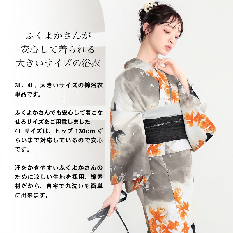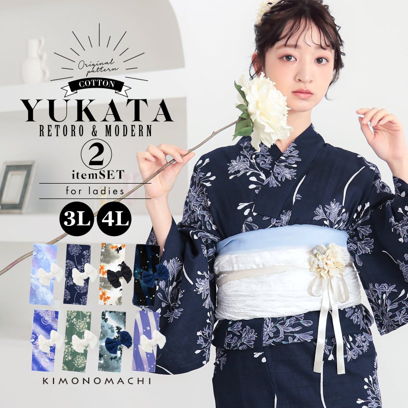 KIMONOMACHIオリジナル!3Lサイズ、4Lサイズの大きいサイズの浴衣と帯がセットになった、コーディネート済みレディース浴衣セットです。