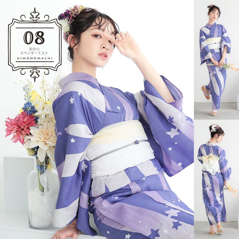 浴衣:灰みの青藤色の地に天の川のようなよろけた太いストライプ、手描き調の星。ストライプの中はミスティな薄紫のグラデーションに白い星々、星雲のようなほのかな黄色の挿し色。