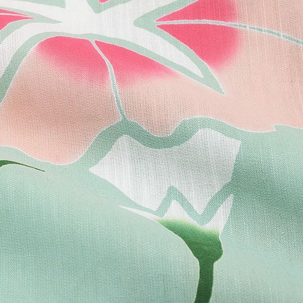 【カラー】浴衣は柔らかなグリーン地に、ピンク、ブルーの大きな朝顔模様。帯はわずかに緑みを含んだようなくすんだ青色のチャック柄。