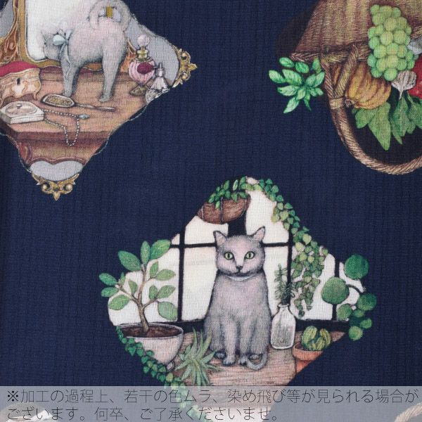 和風館×Frutta rossa浴衣4点セット「紺色 猫のサーシャ」ポリエステル浴衣 三分紐、帯留めの帯飾り付き 吸水速乾 お仕立て上がり浴衣セット 変わり織り 【メール便不可】