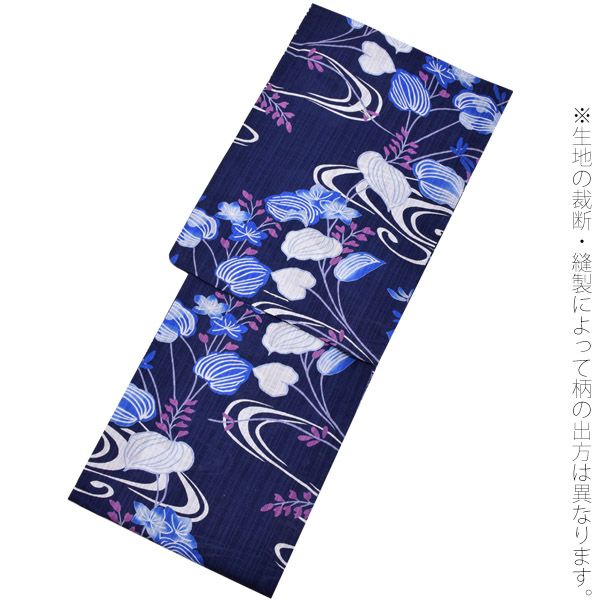 7. 龍村美術きもの浴衣4点セット「紺色 流水に葵」綿麻浴衣 三分紐、帯留めの帯飾り付き お仕立て上がり浴衣 プレタ浴衣 麻混 【メール便不可】