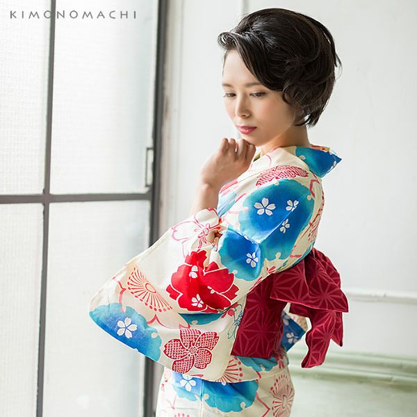 【カラー】浴衣は淡いクリーム色地に、赤ピンク、ブルーなどの色使いの雪輪に桜のお花模様。帯は落ち着いた赤色。下駄は鼻緒は白色地に赤、紺色の風車のような幾何学模様。台は黒色の塗り。