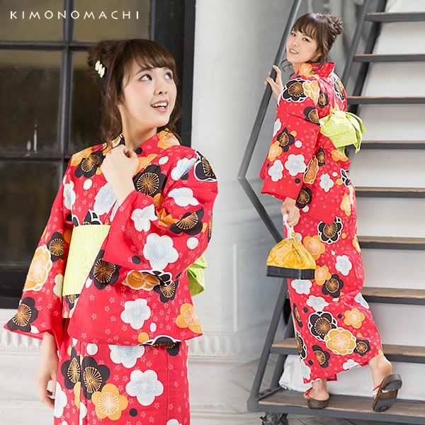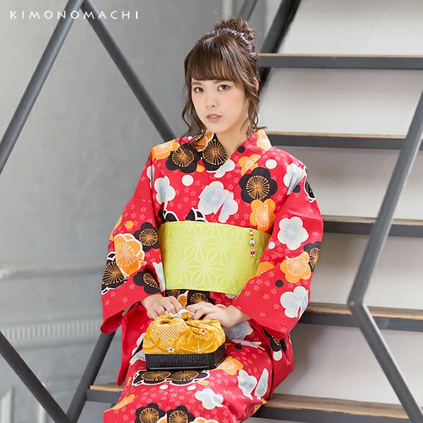【カラー】浴衣は濃い赤色地に細かな小桜、まん丸な梅のお花、水玉模様。帯は黄緑色の、鮮やかなレタスグリーンの色合い。鼻緒は鮮やかな黄色地に梅のお花模様。台は焼桐の焦げ茶色。