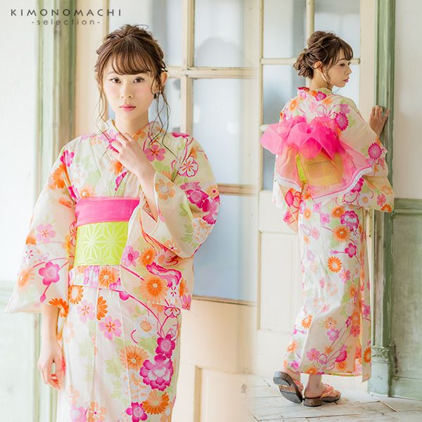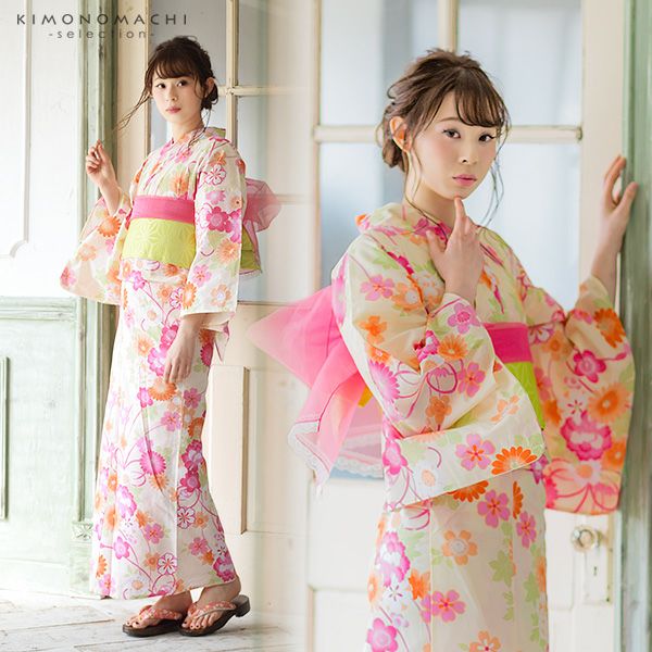 【カラー】浴衣は淡いクリーム色地に、牡丹、菊などの花くす玉模様。帯は黄緑色の、鮮やかなレタスグリーンの色合い。下駄は鼻緒は鮮やかな赤色地に桜模様。台は黒色の塗り。