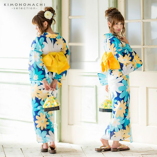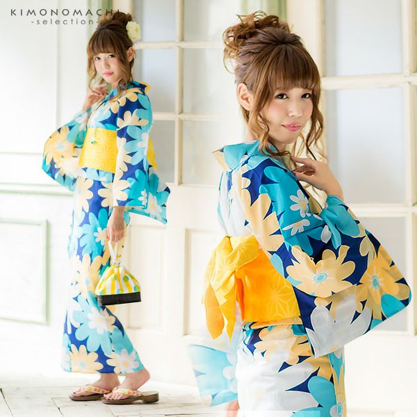【カラー】浴衣は濃い青色地にポップな大きめのお花模様。帯はマリーゴールドのような、明るめの黄色。下駄は鼻緒は白×少し浅めのブルーのストライプ模様。台は焼桐の焦げ茶色。