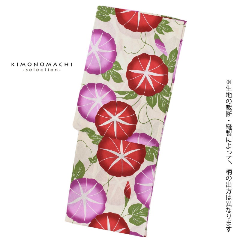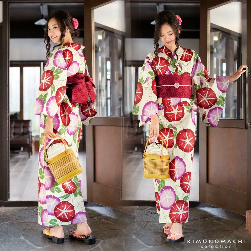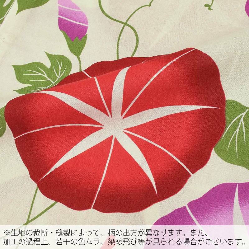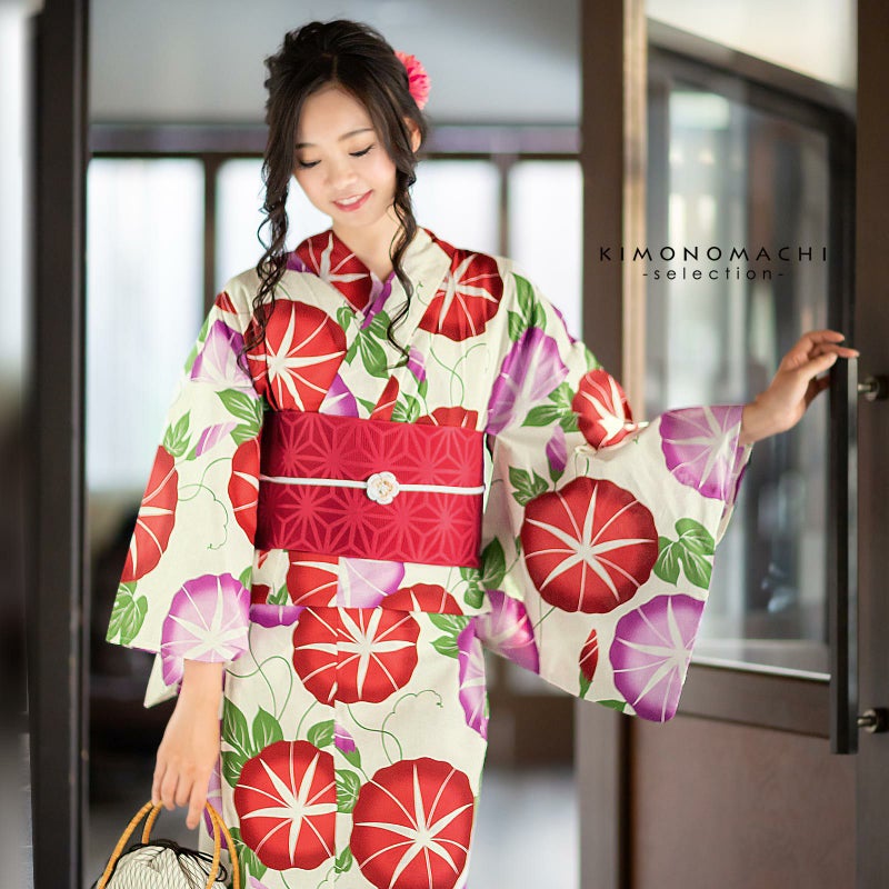 浴衣:淡いクリーム色の地に赤と紫色の朝顔の花。明るい抹茶色の葉。