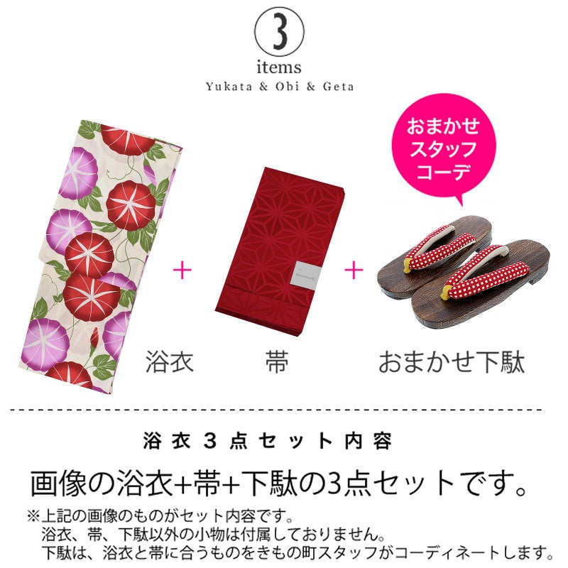 お仕立て上がりの女性浴衣と浴衣帯と下駄の3点セットです。