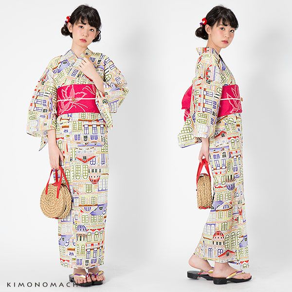 【カラー】浴衣は、全体に細かに描かれたパステル調の色使いのカラフルな建物模様。帯は、赤みの強い濃いピンク色に蝶々の模様。