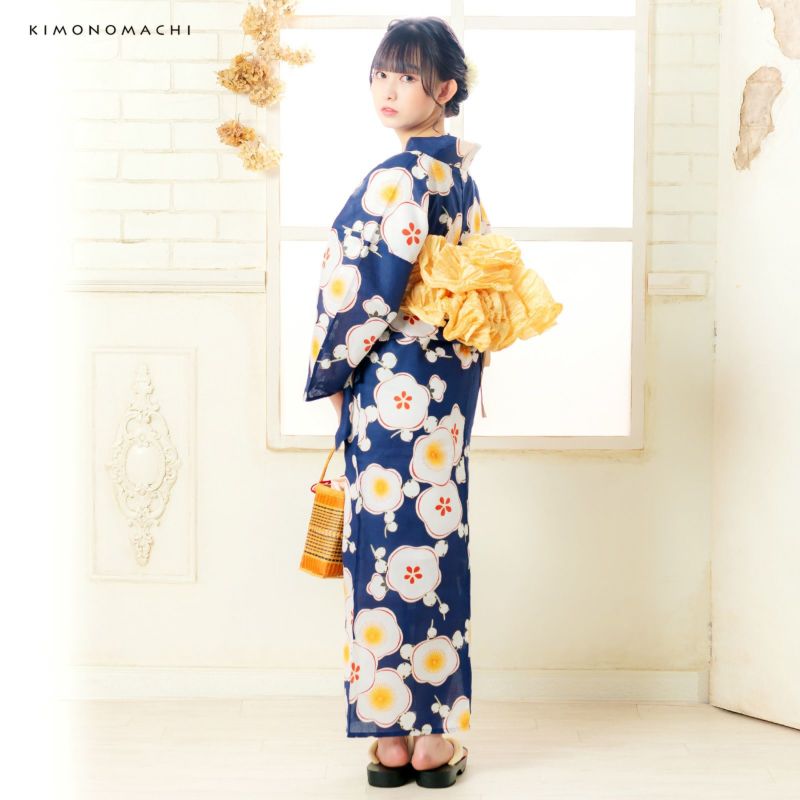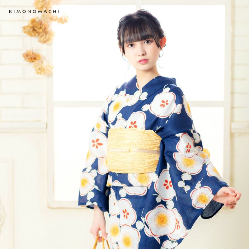 浴衣:紺色地に柔らかな丸みと曲線のある白い梅の花。花の部分には茶色がかった赤色のラインや、ところどころ色づいた黄色が使われています。花の間から少しだけ覗く枝の部分は薄いグレー。