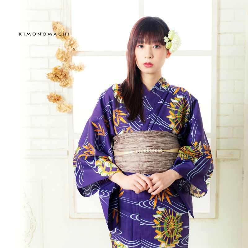 浴衣:青みのある紫色地に、水色の流水模様。水の流れの合間から、2種の水車と笹の葉が見えるのが涼しげ。水車の部分は白色と鶯色に明るいオレンジ色、ラインとところどころに黄土色。笹の葉は明るいオレンジ色に、影のように茶色がほんのりと。