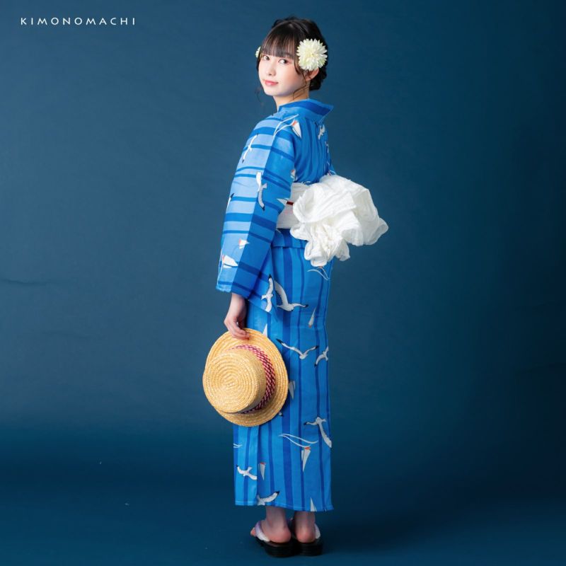 浴衣:シンプルで可愛らしい、マリン柄。濃い目の水色地に、太さの異なる青色の縦ライン。海や空のブルーを思わせる色合いの上のところどころに、黒いラインと白色で翼を広げて飛ぶカモメ、そして波の上に浮かぶ白いヨットのイラスト。