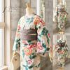 浴衣:パステルグリーン地にピンクの大きな丸椿