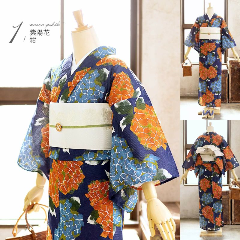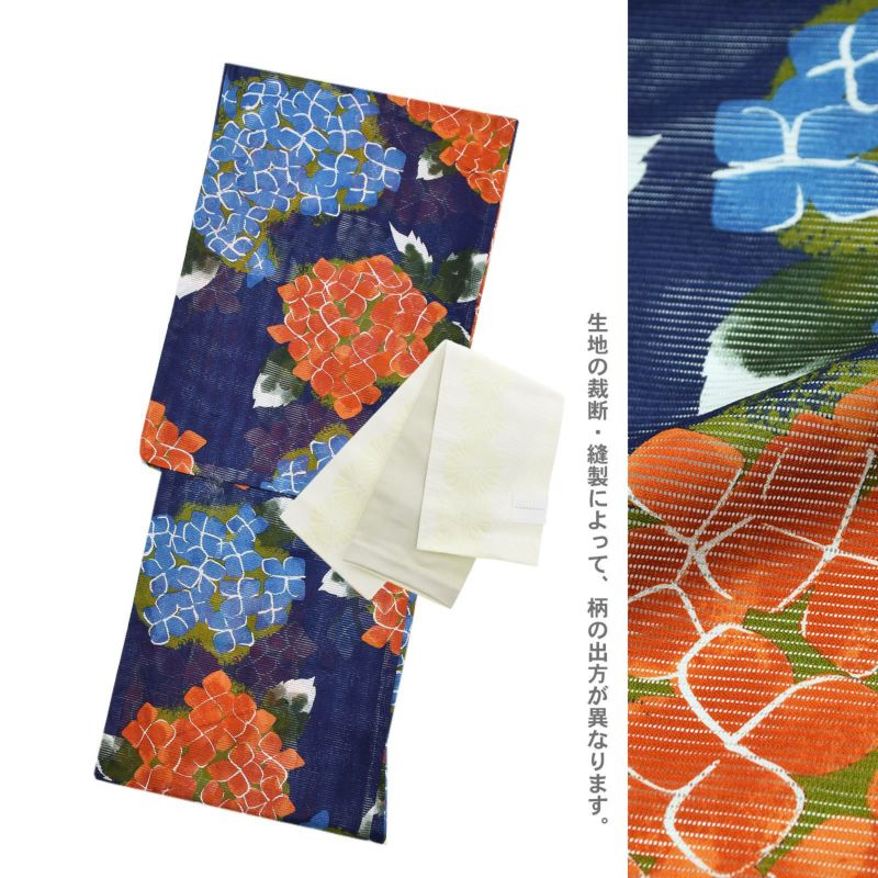 浴衣:紺地に、ペイント風に描かれたオレンジとブルーのあじさい。