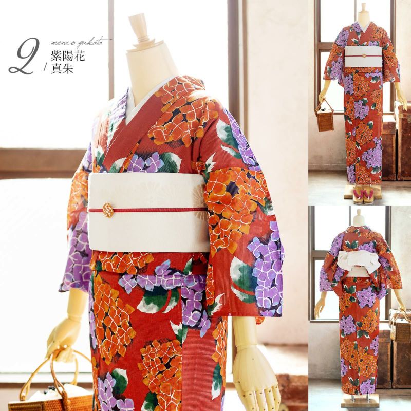 浴衣:暗めの朱赤地に、ペイント風に描かれたオレンジとパープルのあじさい。