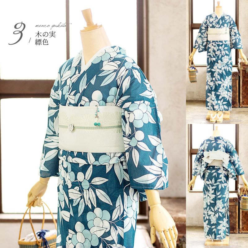 浴衣:やや緑みを帯びた暗めの青地に、白と水色のグラデーションの木の実。