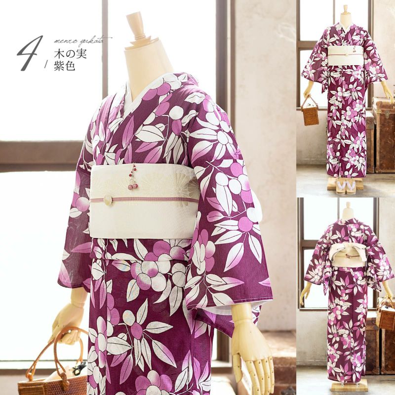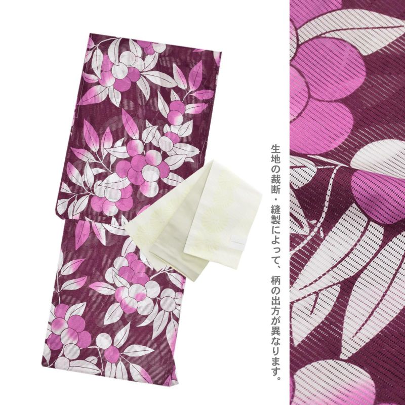 浴衣:ワイン色のような赤みのパープル地に、白とピンクのグラデーションの木の実。