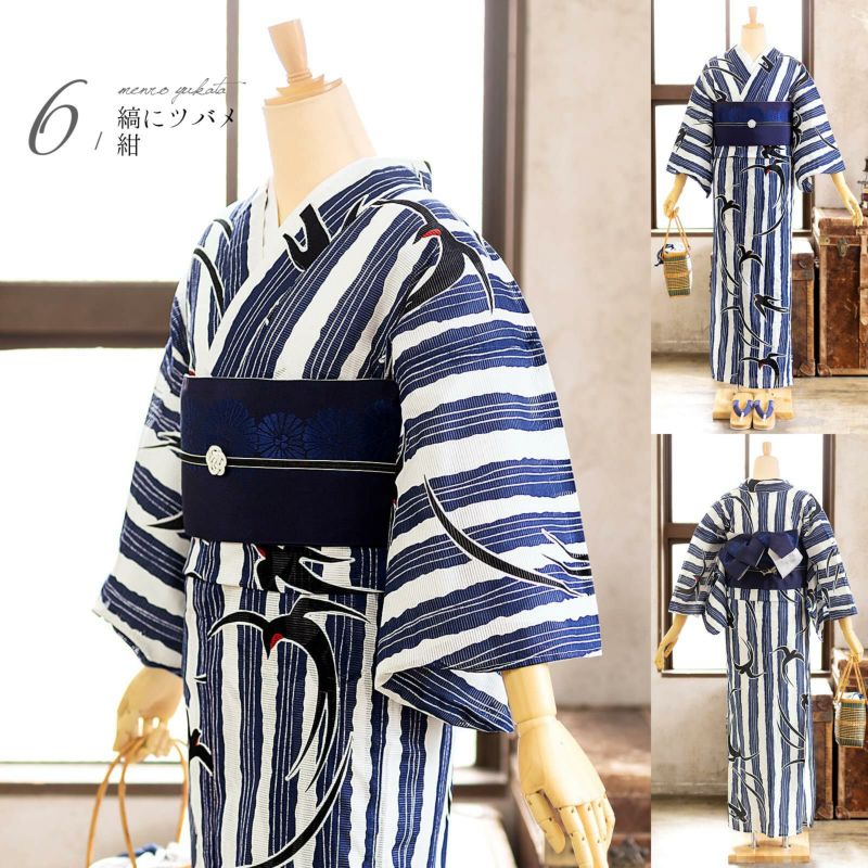 浴衣:白地に、紺色の縞と燕(つばめ)